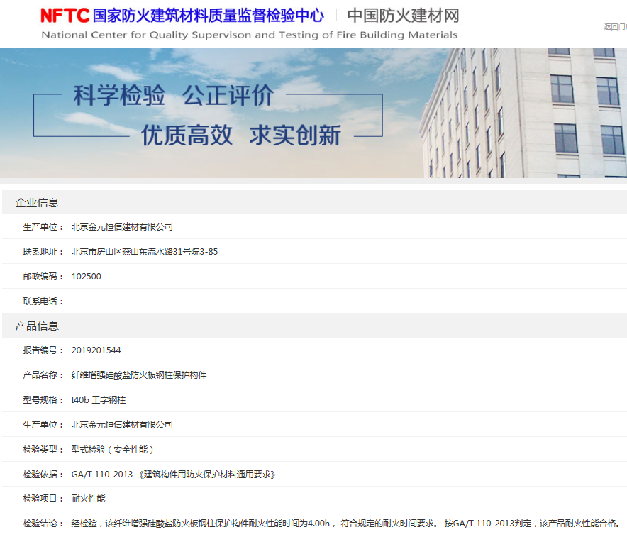采用12mm防火板鋼柱包覆可達(dá)到防火4小時(shí)耐火極限,防火完整性與隔熱性能穩(wěn)定,有國家防火建筑材料質(zhì)量監(jiān)督檢測中心出具的防火板鋼柱包覆4小時(shí)耐火極限型式檢測報(bào)告。 可到中國建材防火建材網(wǎng)上查詢:http://www.fire-testing.net/ 查詢真?zhèn)危?/span>以下是我公司防火報(bào)告查詢結(jié)果頁面