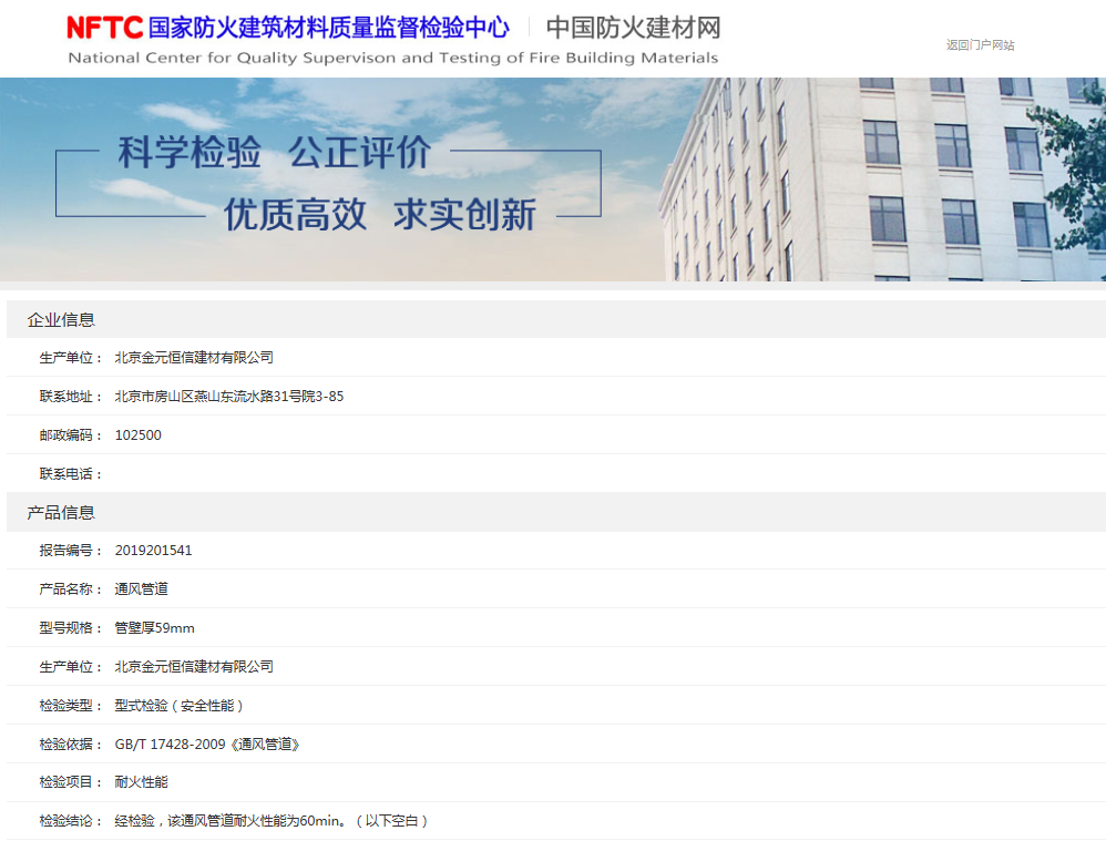 通風(fēng)管道壁厚59mm可達(dá)到防火1小時(shí)耐火極限,防火完整性與隔熱性能同時(shí)滿足,有國(guó)家防火建筑材料質(zhì)量監(jiān)督檢測(cè)中心出具的通風(fēng)管道1小時(shí)耐火極限型式檢測(cè)報(bào)告。